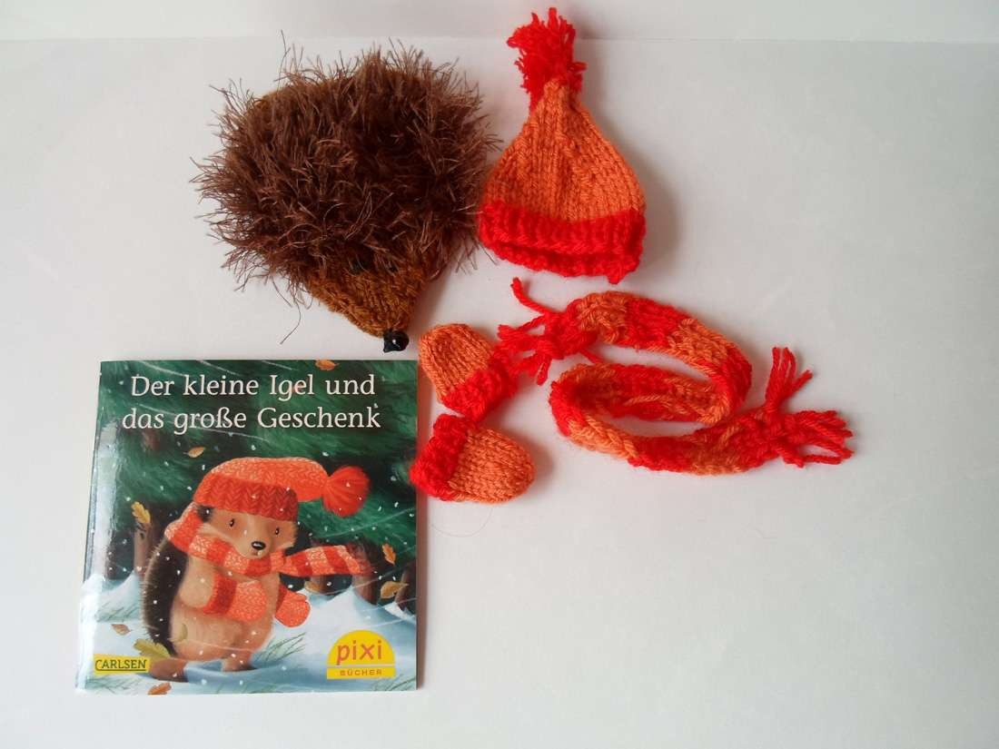 Das Set besteht aus laufenden Igel mit roter Mütze, Schal, Handschuhe und Pixibuch.